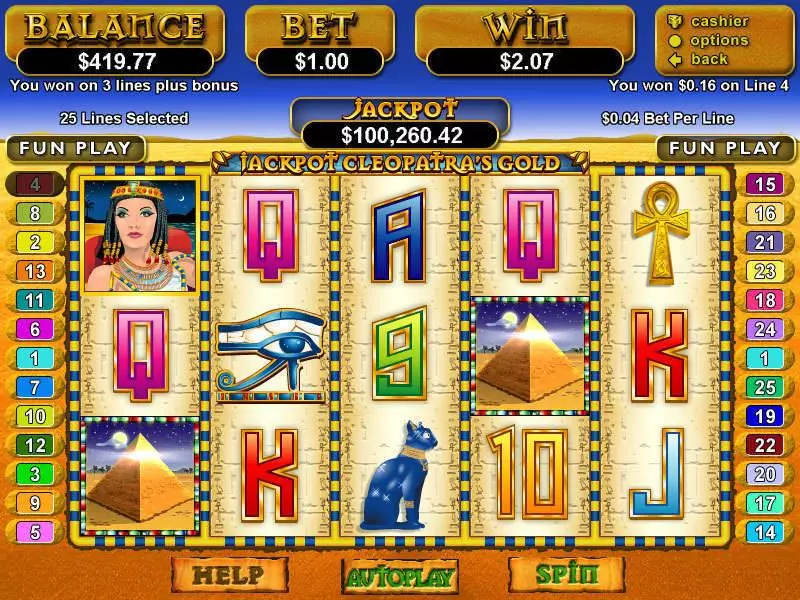 Jackpot Cleopatra's Gold is a 5 Reel / 25 Line slots game, released by RTG in 2009
