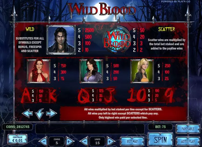 Wild Blood is a 5 Reel / 15 Line slots game, released by Play'n GO in